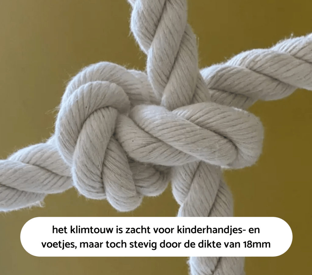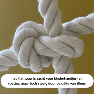 Het klimtouw is 100% natuurlijk katoen en dus vrij van schadelijke stoffen. Heerlijk zacht voor de handjes van je kindje, maar toch stevig genoeg om te klimmen en aan te hangen!