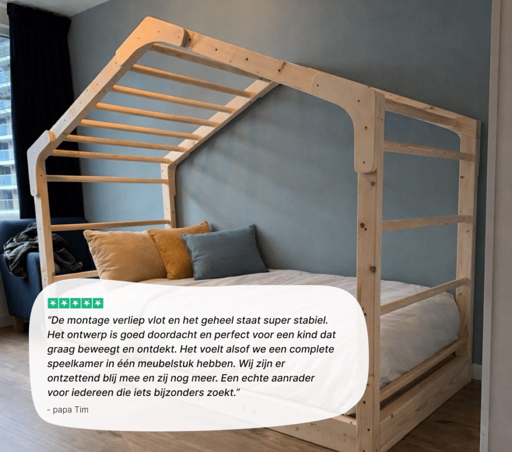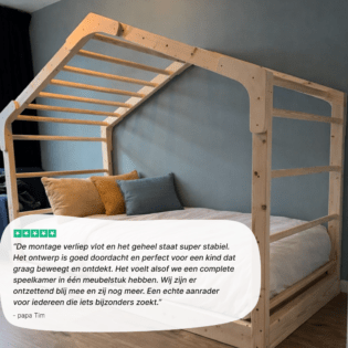Dit klimbed is bewust ontworpen als vloerbed. Een vloerbed staat laag bij de grond en geeft kinderen de vrijheid om zelfstandig te bewegen en veilig te spelen. Voor kinderen zorgt dit voor een vertrouwde basis, terwijl ze volop ruimte hebben om te klimmen en actief te zijn.
